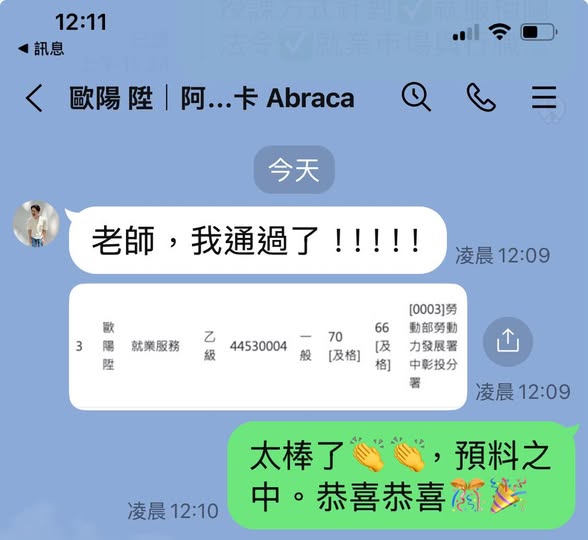 我想很多同學準備這張就業服務乙級技術士證照都還在職、壓力大、時間也有限。老師的教學非常理解我們的需要,所以採用: •用最簡化的方式整理法條 •大量舉例讓記憶具有情境 •不用艱深語言,而是用貼近職場的方式解釋 這種教學方式讓我覺得自己「是在被帶著前進」,不是在硬撐。 我要非常謝謝周老師,也推薦周老師的課程喔!