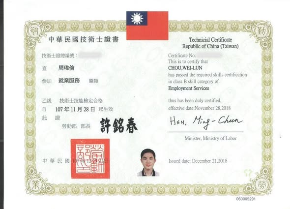 通過「就業服務乙級技術士」考試,可以申請勞動部《技術士》與《就業服務專業人員》雙證書,如圖示。