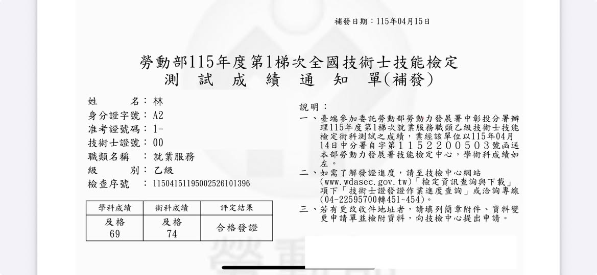 意外的是術科居然比學科高分,真的很驚喜!最擔心的居然考得比較好,非常感謝老師的講義跟指導,突破我的盲點,也非常感謝老師的鼓勵,只要不放棄,沒有什麼達不到的,謝謝老師!